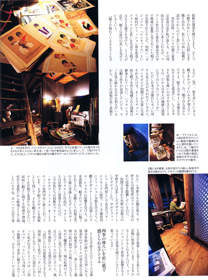 At around nine thirty every morning, Mr. Hirano leaves his house by the waterway and walks along the stream to the atelier for about forty minutes. He works there until seven or eight in the evening. Many times during work, he goes up and down the steep stairway effortlessly like a young man. His quick movements make him look like a brave fighter, who, armed with hat design, has led his team to fight a battle at the center of the world. May his dream—to build a private hat museum—come true soon!