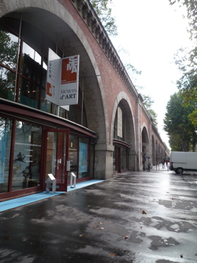 場所は、バスチーユBastilleオペラ座の横(レンガの長い建物でフランス伝統産業工房。外から仕事をしている様子が見える。その上が歩道。素晴らしい環境)のギャラリーで9人の帽子デザイナー合同展へ訪問。