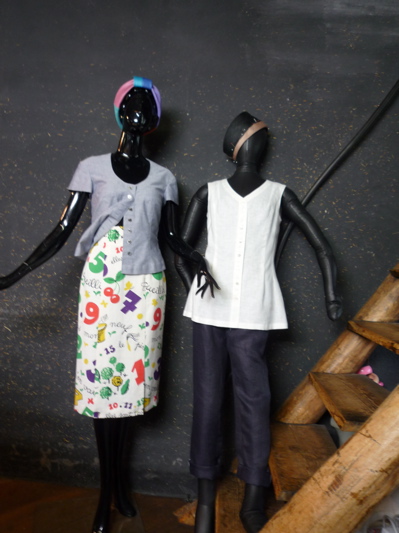 ショルダーがポイントのブラウスとハイウエストのスカート 。