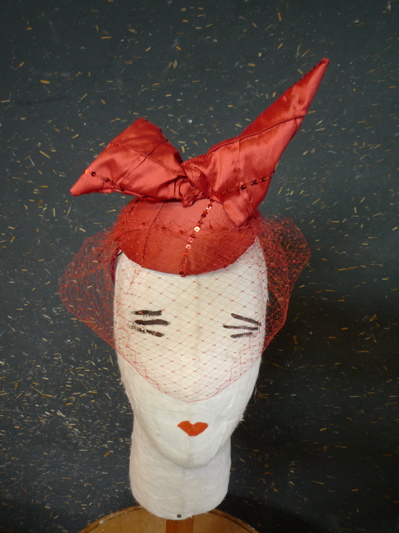 スパンコール付きシルク地ヘッドドレスに1950年代のフランス製ベールが付いている。