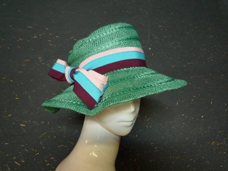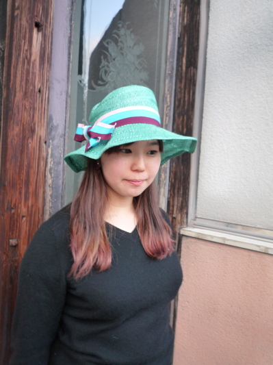 インターナショナル科 宮村さん初めて製作の帽子。トリミングのリボン色合わせは、デザインの勉強が役立った。