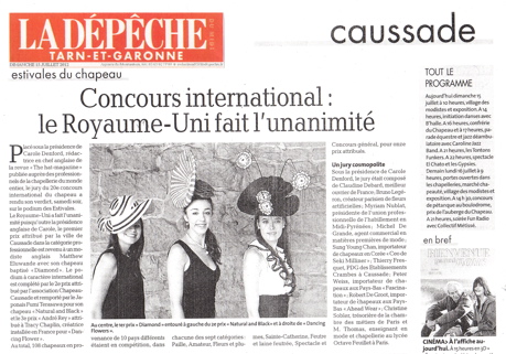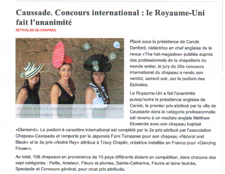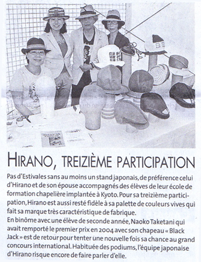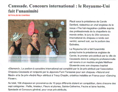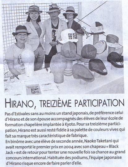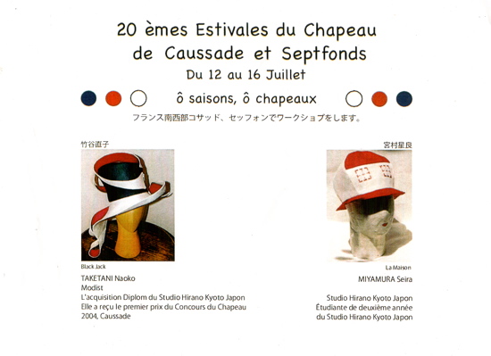 世界的著名な帽子コンクールEstivales du Chapeau、(フランス南西部)コサッド セットフォンインターナショナル帽子コンクール20回記念(2012年7月12日〜16日)に於いて<総合部門2位>を授賞致しました。