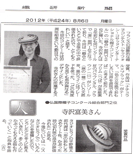 | フランス コサッド Estivales du Chapeau 帽子コンクール2位授賞の 寺沢富美が繊研新聞へ掲載 |