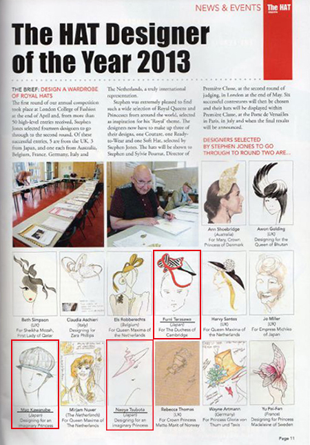 デザイン画審査14人中STUDIO HIRANO KYOTO JAPONから スタッフ 寺沢富美(Fumi TERASAWA)坪田尚也(Naoya TSUBOTA) 研究生 川那辺真央(Mao KAWANABE)3人入選 5月末、帽子審査に於いて6人選出 パリにて7月7日3位迄が決定 |