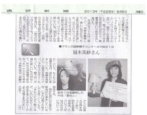 | フランス コサッド Estivales du Chapeau プロフェッショナル部門1位受賞の 冠木美紗(入学2年目)が繊研新聞へ掲載 |