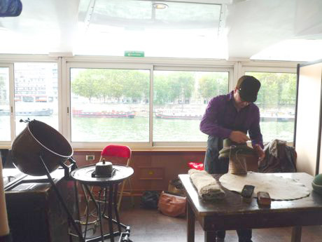 ATELIER-MUSEE DU CHAPEAU 帽体を木型に入れるデモンストレーション |