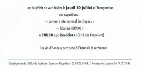 コンクール参加の帽子展示会と歴史に残るべき日本のクリエーター、平野徳太郎の独創的な作品を見るために多くの人が会場に足を運んだ。コンクールには200もの帽子が世界各国から寄せられた。コサッド帽子会会長は、オーストラリア、イタリア、イギリス、チェコ、ドイツ、アイルランドなどからの参加があったといい、また彼はこのフェスティバルを支えてくれている市、ボランティア、スポンサーに感謝の意を表していた。「コサッド帽子会チームは土曜日の帽子のファッションショーに向けて一丸となっている。また今回の新機軸として、「ワンちゃんとご主人さまのショー」も企画している」と彼は語った。市長のフランソワ・ボンノムは彼自身が尽力した新たなる観光局にある帽子展示スペースについて語り、セッフォン市長ジャック・タバリとイザベル・バラバンに感謝した。さらには平野徳太郎は伝統的な祝い酒をふるまい多くの人々がその味を楽しんだ。