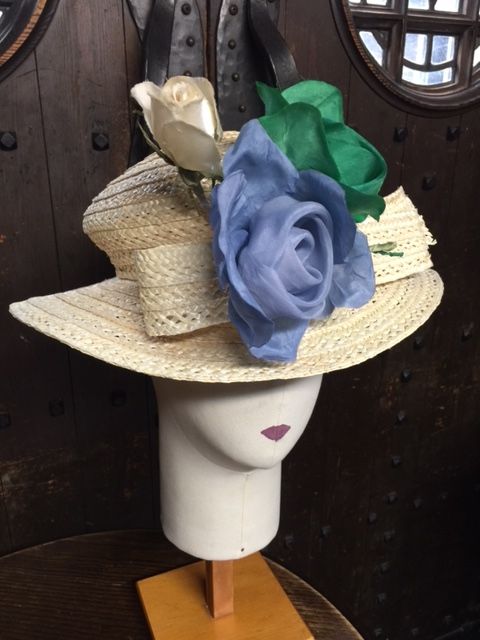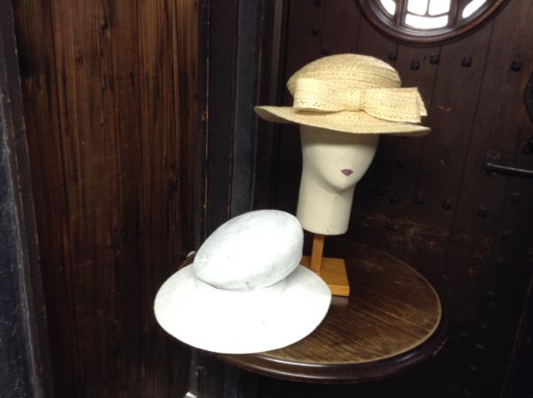 同じ造花が付け方の変化で異なる帽子となる。