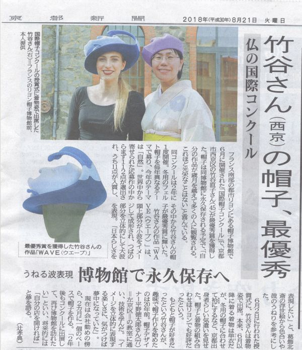 フランス リヨンATELIER-MUSÉE DU CHAPEAU に於いてSTUDIO HIRANO KYOTO JAPON 卒業生 竹谷直子コンクール一位が京都新聞8月21日(火)素晴らしい記事掲載。