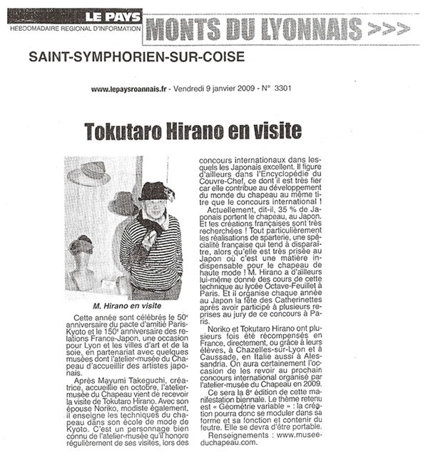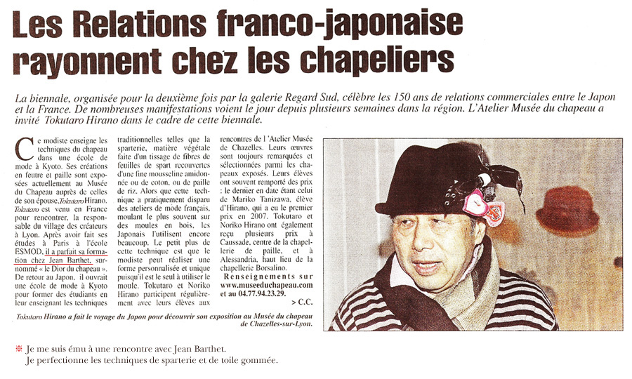 ギャラリー・レガール・シュッドによって催された第二回ビエンナーレは、日仏交流150周年を記念し開催された。フランスのリヨン市において、いくつもの催しがとり行われた。帽子博物館は、この第二回ビエンナーレに際して、平野徳太郎氏を招待した。<平野徳太郎氏は、シャゼル=シュール=リヨンの帽子博物館の展示を見るために日本から駆けつけた。
